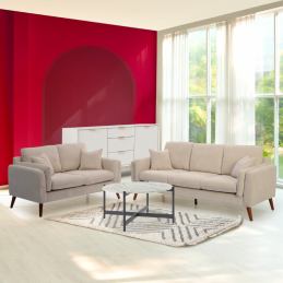Le canapé 3 places + canapé 2 places  Revêtu de tissu 100% polyester, garnissage en mousse polyuréthane de densité 12-24kgs/m3. Structure en panneaux de particules et bois divers, sangles élastiques et ressorts ensachés. Pieds en pvc coloris noir. Coloris: Vert Terracotta Beige Gris foncé Dimension: Canapé 3 places : Longueur 214cm * Profondeur 65cm *...