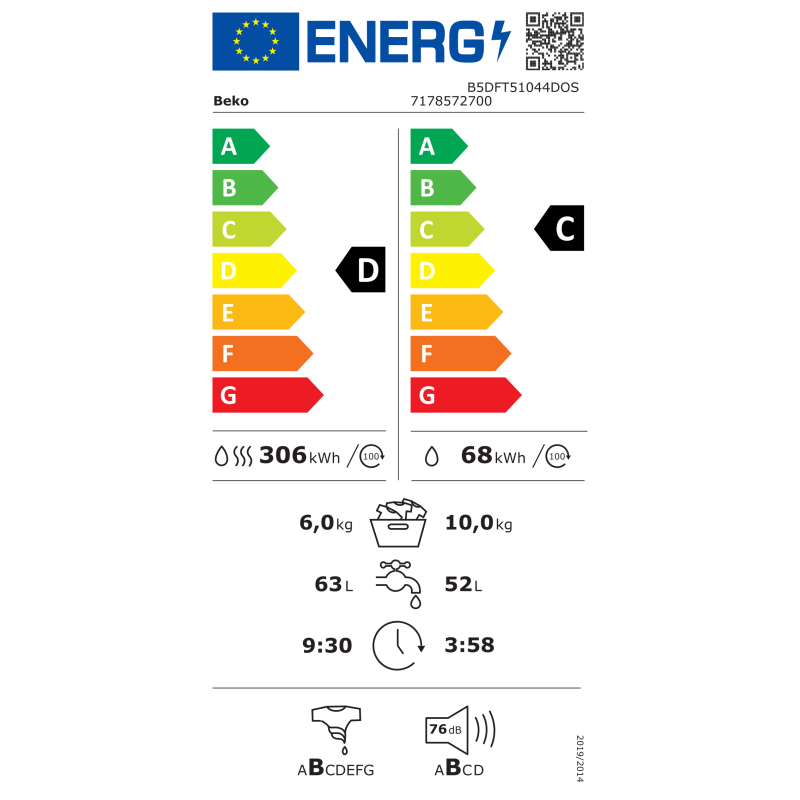 LAVE-LINGE SÉCHANT HUBLOT - 10/6 KG - 1400 TRS/MIN - BLANC - BEKO - B5DFT51044DOS