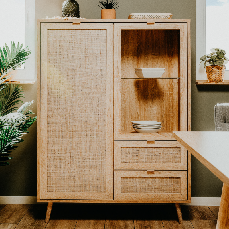 Ce vaisselier combine une esthétique moderne avec une finition réaliste en chêne et cannage, parfait pour un intérieur contemporain.