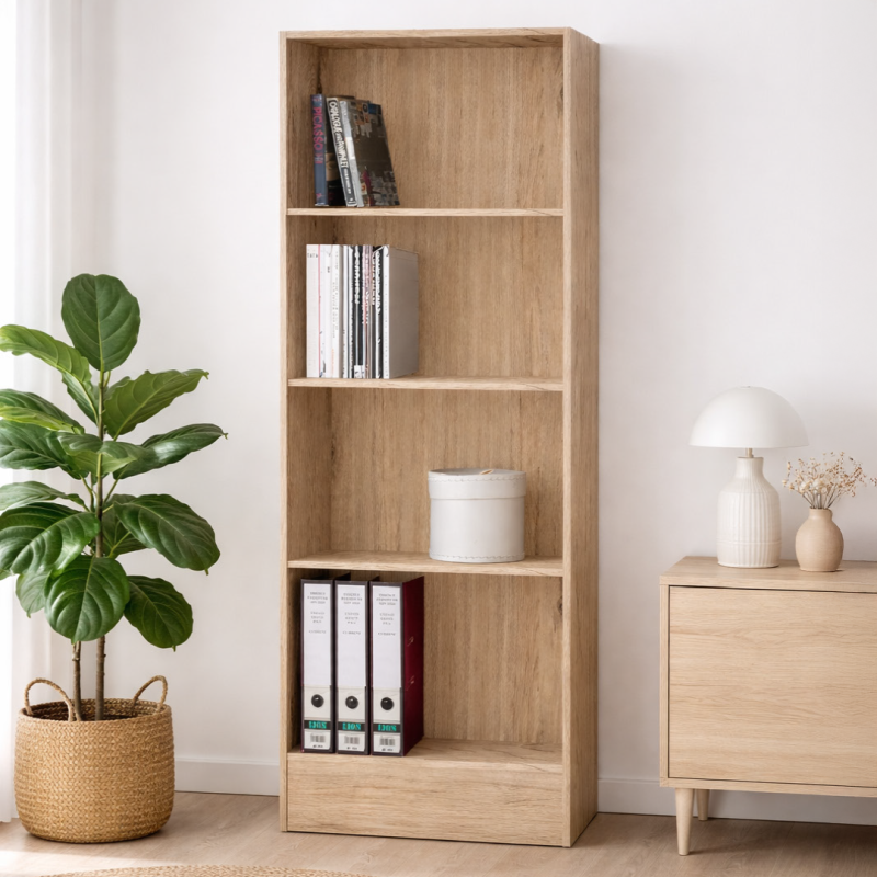 Le meuble est fabriqué à partir de panneaux de particules de bois, recouvert d'un mélaminé au décor chêne sonoma