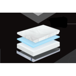 Mousse à mémoire de forme haute densité 28kg, 3cm + Mousse haute densité 25kg, 17cm.