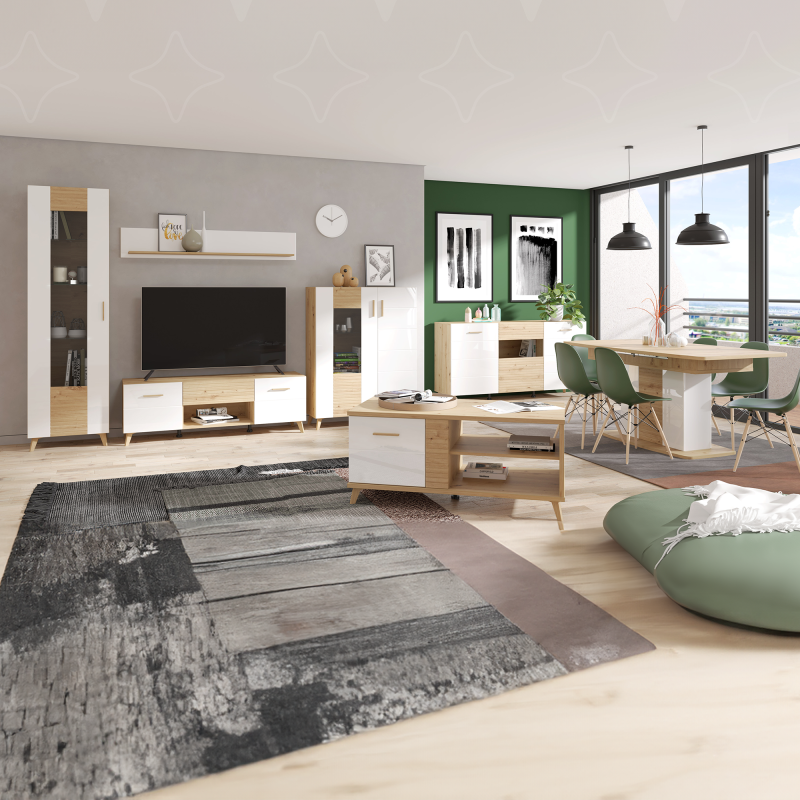structure panneau de particules revêtus de papier décor finition laque blanc et coloris chêne comprenant une porte vitrée et des étagères vitrées.