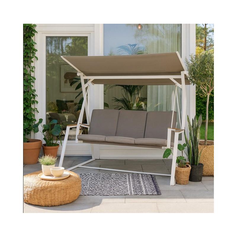 Balancelle de jardin extérieure 3 places, offrant un confort optimal grâce à ses coussins d'assise et de dossier. Les sièges en maille respirante sèchent rapidement, tandis que le cadre en acier enduit de poudre, capable de supporter jusqu'à 300 kilos assure robustesse et durabilité. Les ressorts de qualité garantissent un mouvement de balancement doux et fluide. Le design avec un accent boisé ajoute une touche naturelle. Le toit de l'auvent est inclinable pour un meilleur ajustement.