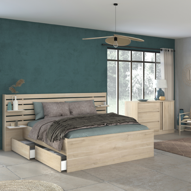 Découvrez ce lit en 140 * 200 cm avec ses tablettes chevets amovibles vous permettent de personnaliser votre tête de lit grâce à sa réversibilité beige et blanc. Au besoin, ajoutez des tiroirs pour ranger vos objets les plus encombrants.