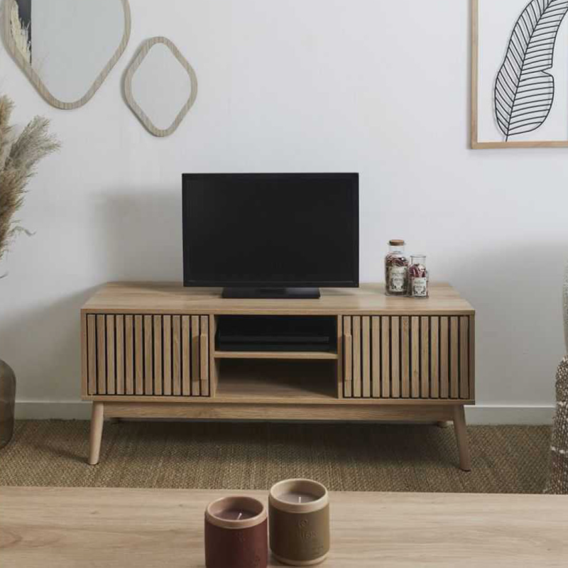 Le meuble TV arbore un design élégant et sophistiqué grâce à ses lignes épurées et son fini en bois qualité. Fabriqué à partir de panneaux de particules de haute qualité, de panneaux à densité moyenne (MDF) et de pin, le meuble TV est robuste et durable.