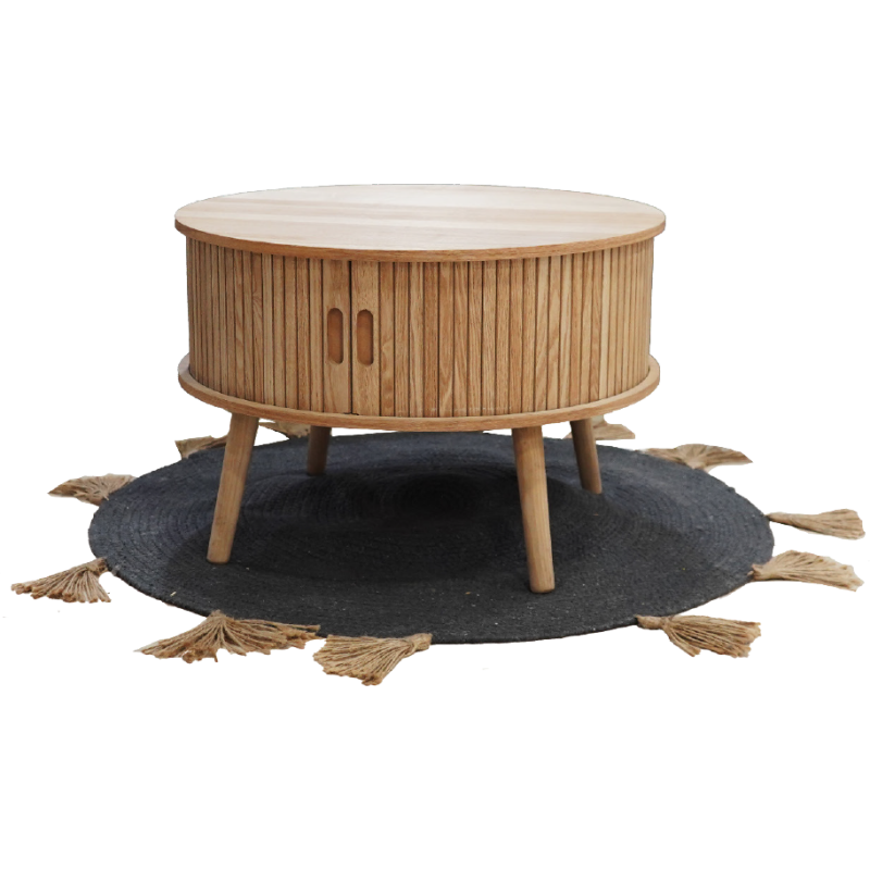 Table basse avec portes coulissantes avec des lattes et des pieds en panneaux de particules.