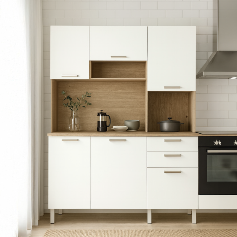 Loge tout - comprenant 3 portes, 1 tiroir, 1 niche micro-ondes et 3 autres niches - Description du produit : Ce meuble multifonction "Loge tout" est idéal pour optimiser l'espace dans votre cuisine ou votre salle à manger. Il dispose de plusieurs rangements pratiques : 1 niche micro-ondes pour un rangement dédié à votre appareil électroménager. 1 tiroir...