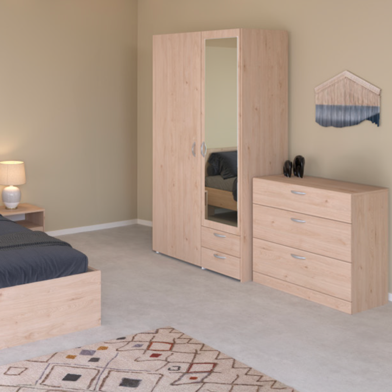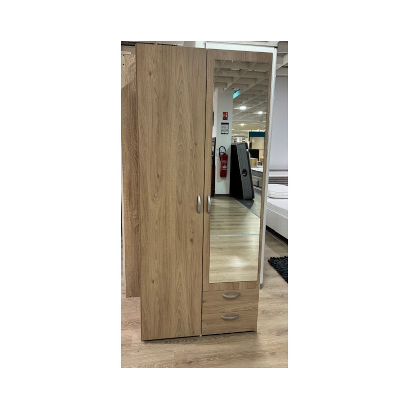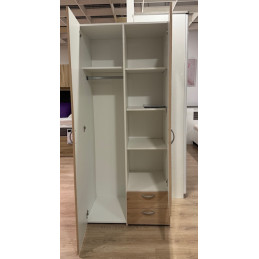 Structure : Les armoires sont fabriquées en panneaux de particules avec un décor "Jakcson Oak" et sont dotées de poignées en aluminium. Ce meuble de rangement est doté de deux portes et de deux tiroirs. A l'intérieur, l'armoire est équipée d'une tringle à vêtements et de quatre étagères. Les produits sont fabriqués en panneaux de particules, avec une épaisseur de 15 et 22 mm.