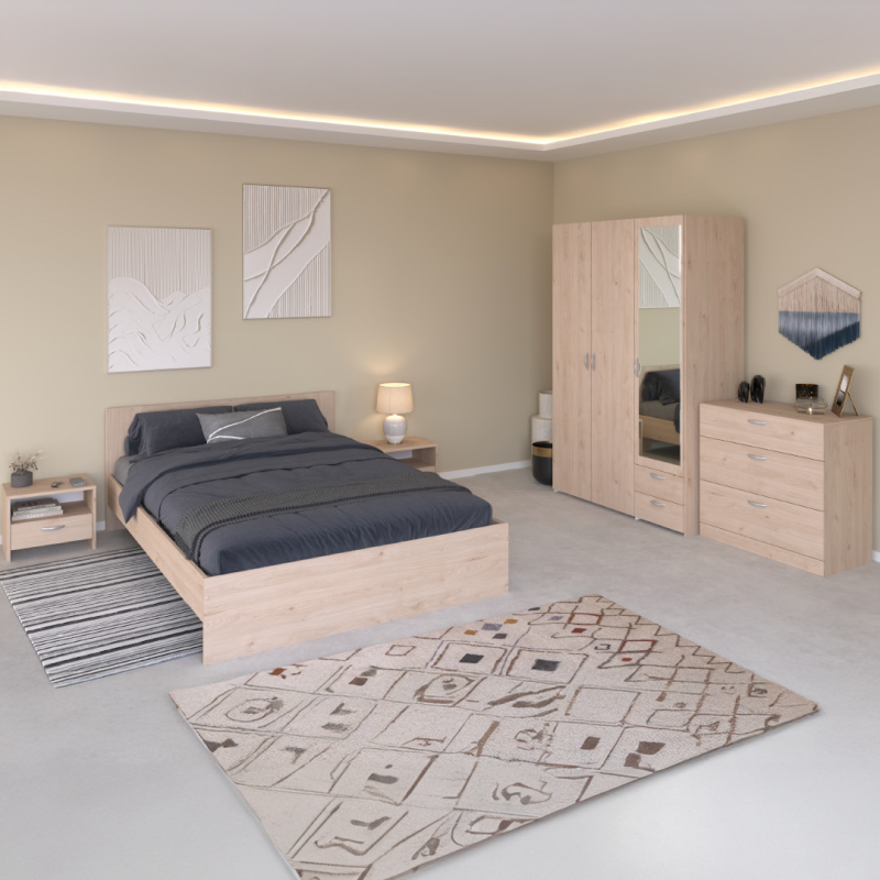 COMPREND Le chevet 2 tiroirs STRUCTURE  En panneaux de particules revêtus décor papier couleur beige et noyer silver DIMENSION  Chevet 43,5 X 34,4 X 33 CM A monter soi même.