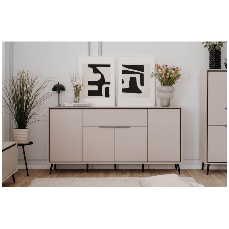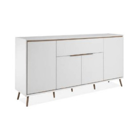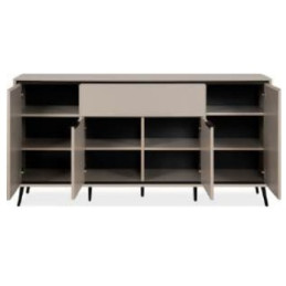 Offrant un design moderne et fonctionnel, ce buffet est idéal pour organiser votre intérieur avec style. Il est équipé de 4 portes, 1 grand tiroir, et 6 étagères pour un rangement efficace et bien réparti. Les pieds noirs en plastique (16 cm de hauteur) assurent une belle stabilité et un look contemporain.