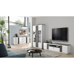Cette collection de salle à manger moderne associe des lignes épurées avec des finitions laquées blanches et des touches contrastées gris foncé. Le design joue sur la sobriété et l’élégance avec un mobilier fonctionnel.