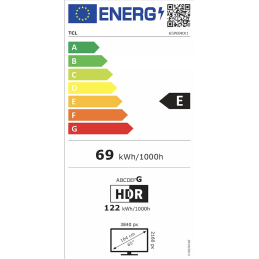 Économe en énergie, cette télévision affiche une classe d’efficacité énergétique E en mode SDR et G en HDR, avec une consommation de seulement 69 W en utilisation standard.