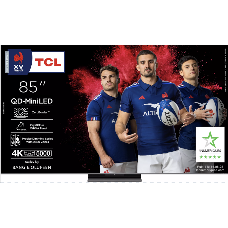 La Smart TV MiniLED 85" de TCL allie puissance visuelle et technologies de pointe pour une expérience cinéma à domicile. Dotée d’un écran 4K de 215 cm à fréquence native de 144 Hz, elle offre une fluidité exceptionnelle. Il convient parfaitement pour le gaming comme pour les contenus en très haute définition. Son affichage MiniLED assure des contrastes profonds, des couleurs éclatantes et une compatibilité étendue avec les formats HDR (Dolby Vision, HDR10+, HLG). Sous Google TV, elle embarque Chromecast, Google Assistant, Wi-Fi 6 et Bluetooth 5.3, pour une connectivité ultra complète. Côté son, les 90 W en Dolby Atmos créent une immersion sonore saisissante.