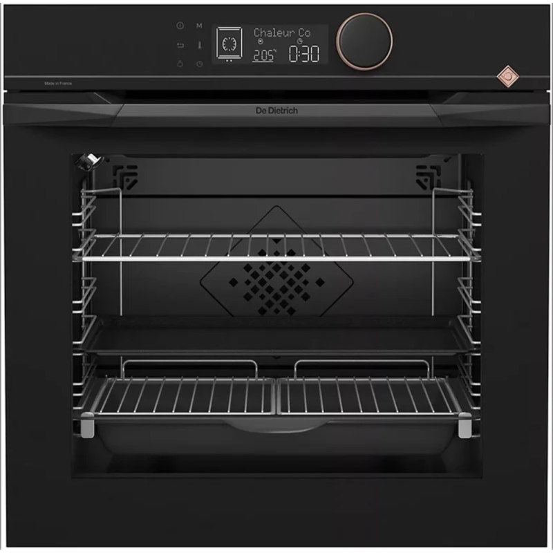 Le four encastrable DE DIETRICH DOP4543H, en finition noire, offre une grande capacité de 73 L avec nettoyage par pyrolyse à 500 °C. Doté de la chaleur tournante pulsée, il propose 16 modes de cuisson, 17 programmes automatiques et 70 recettes intégrées. Il intègre des fonctions avancées telles que basse température, levage de pâte, maintien au chaud et sabbat. La commande s’effectue via boutons et touches tactiles, avec affichage LED blanc. Il dispose d'une porte froide à 4 vitres avec fermeture douce, de 2 niveaux de rails télescopiques, d’une cavité en émail et d’une classe énergétique A+.