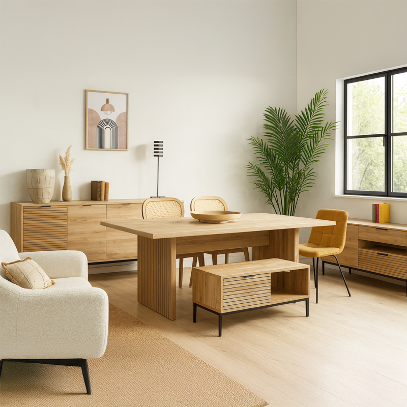 Meuble Télé - Coloris chêne Découvrez notre gamme, où le design épuré rencontre la fonctionnalité. Cette collection incarne l'équilibre parfait entre modernité et chaleur naturelle. L’enfilade et le bahut apportent une solution de rangement avec leurs portes et niches, ils permettent une organisation optimale tout en ajoutant une touche design à votre...