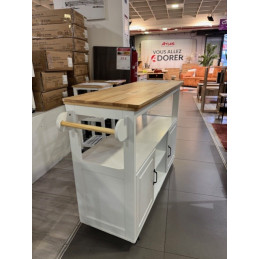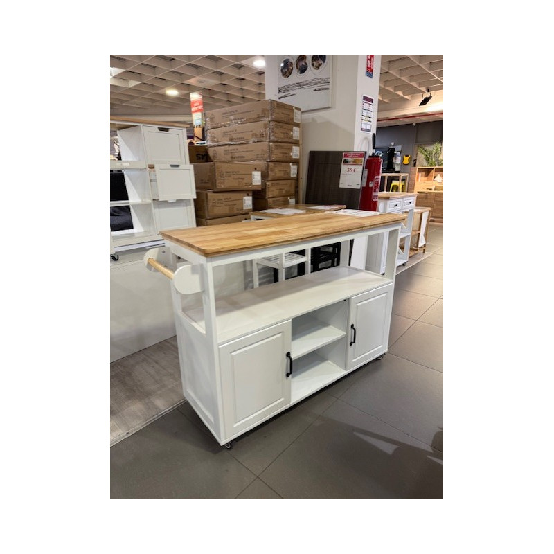 Ce chariot îlot de cuisine est conçu pour offrir une solution de rangement pratique et élégante. Il comprend une étagère, deux portes et deux niches ouvertes, permettant d’organiser facilement vos ustensiles, appareils ou provisions.