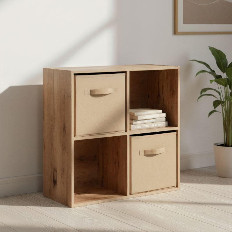 Structure en panneaux de particules décor chêne artisanal, finition bois stratifié. Comprend 2 étagères fixes et 4 compartiments. Livrée avec 2 boîtes de rangement en tissu imperméable. Façade ouverte.