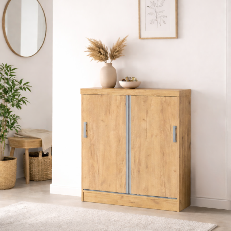 Structure : en panneaux de particules revêtu de papier décor coloris bois.