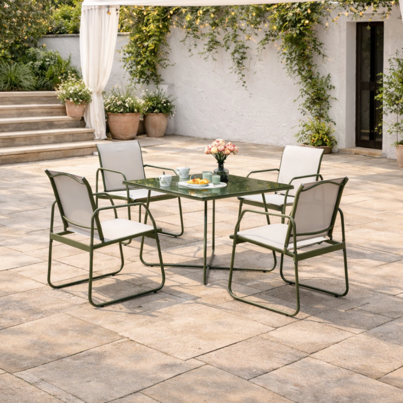 Cet ensemble est composé d’une table carrée avec un plateau en verre trempé et des pieds en métal de la même couleur, ainsi que de quatre fauteuils assortis en métal et textilène.
