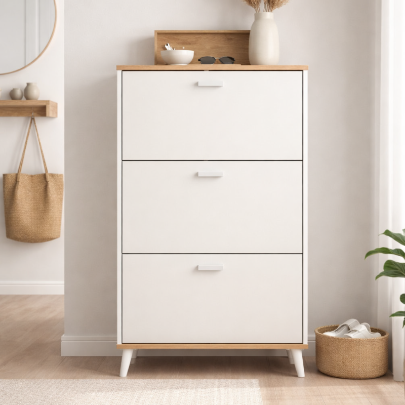 Ce meuble à chaussures pratique permet d’organiser vos chaussures tout en apportant une touche moderne à votre intérieur. Il comprend trois abattants blancs avec une structure en panneaux de particules et un contour en coloris oak. Ses pieds en PVC blanc assurent stabilité et élégance.