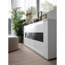 Cette enfilade moderne à 3 portes apporte une touche élégante et contemporaine à votre intérieur. Son éclairage LED blanc intégré dans le plateau crée une ambiance chaleureuse et met en valeur vos objets. Le plateau d’une épaisseur de 30 mm assure robustesse et stabilité. Les portes sont équipées d’un système de fermeture avec ralentisseur Soft Close pour un confort d’utilisation au quotidien. Sa structure en panneaux de particules avec plaquage mélaminé et finition blanc et gris laqué haute brillance s’intègre parfaitement dans un salon moderne.