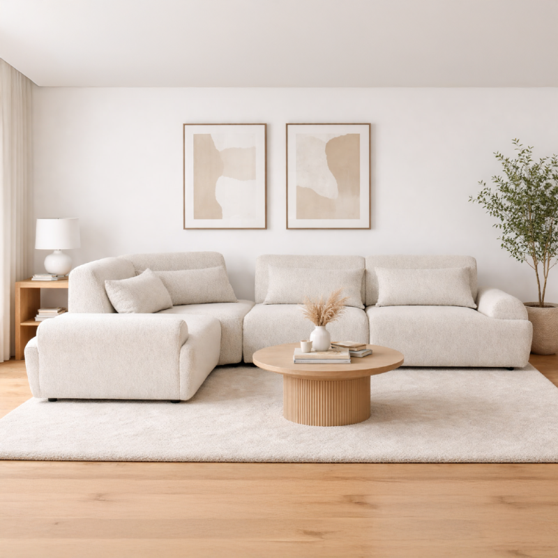 Le salon d'angle 3 places + relax manuel + coffre de rangement. Revêtu d’un tissu 100 % polyester, ce salon allie confort et modernité. Le garnissage en mousse polyuréthane (densité 12/24 kg/m³) offre un excellent soutien. La structure est composée de panneaux de particules, sangles élastiques et ressorts ensachés, assurant une solidité durable. Les pieds...