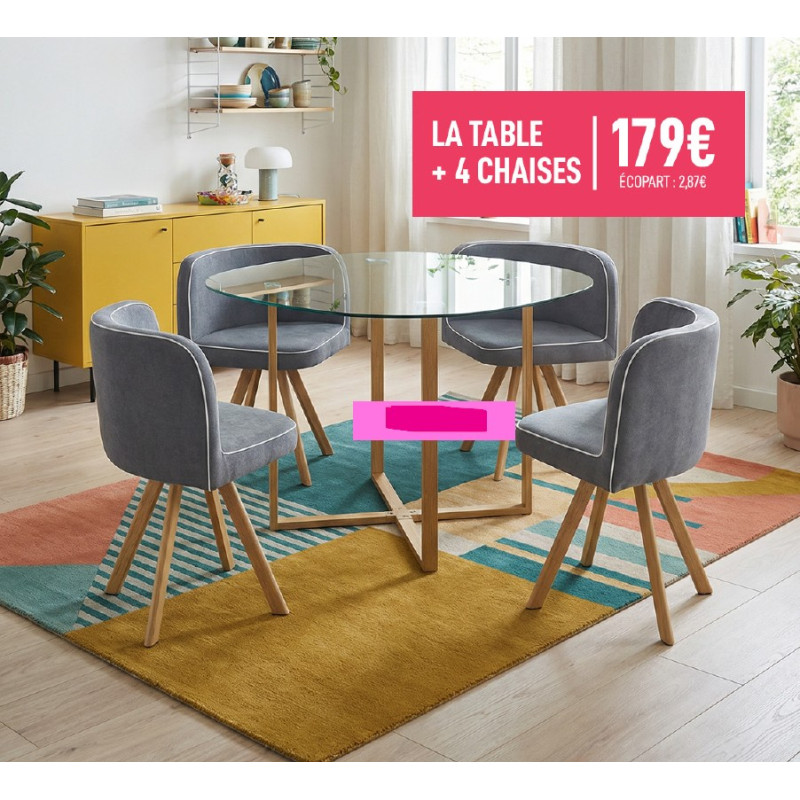 La table ronde + 4 chaises La table ronde. Structure en panneaux de particules revêtu de papier décor finition coloris noir. Piètement en métal noir. Dim. Dia90*H75 cm. La chaise. Structure en panneaux de particules et métal revêtu de tissu 100% polyester. Garnissage mousse polyuréthane densité 12/24kgs/m3. Dimension L58*P43*H87 cm. A monter soi même.