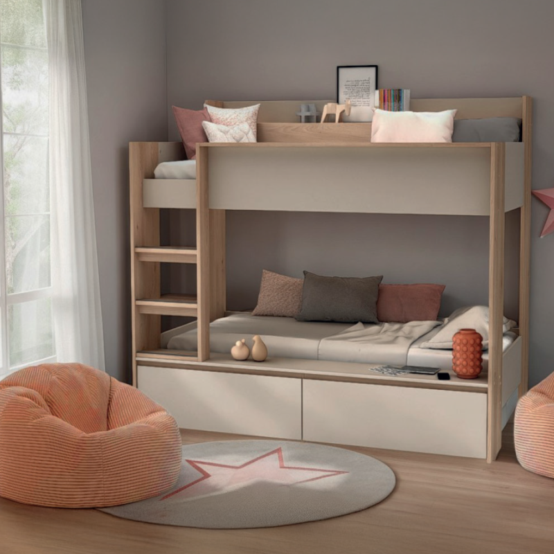 Lit superposé pratique et gain de place, idéal pour une chambre d’enfant. Structure en panneaux de particules revêtus de papier décor. Accès au lit supérieur par échelle intégrée avec 3 marches.