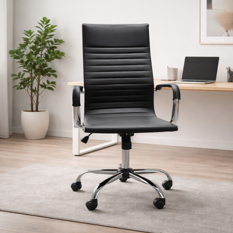 Fauteuil de bureau confortable et élégant, idéal pour un espace de travail. Structure en métal avec garnissage en mousse polyuréthane pour un bon maintien. Accoudoirs avec bras chromés et piètement en métal pour plus de stabilité.
