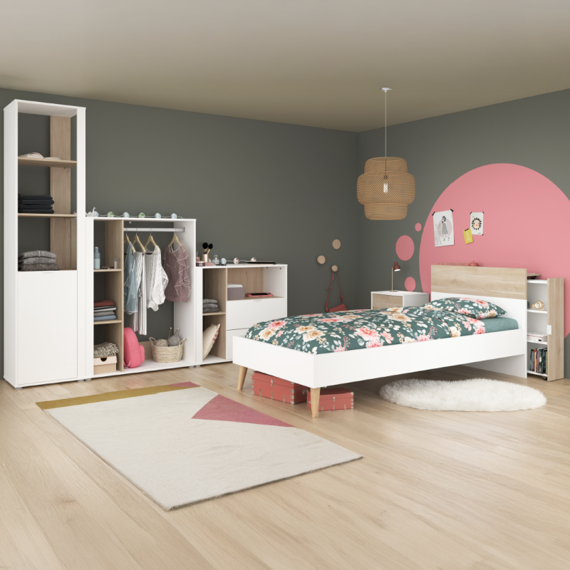 Le double lit mezzanine + 2 bureaux + rangements + 1 placard. En panneaux de particules de moyenne densité revêtus de papier décor blanc et naturel. Couchage 90*200 cm. Vendu avec sommiers. Vendu sans matelas. Dimension L295,7*H180*P232,2 cm. A monter soi meme.
